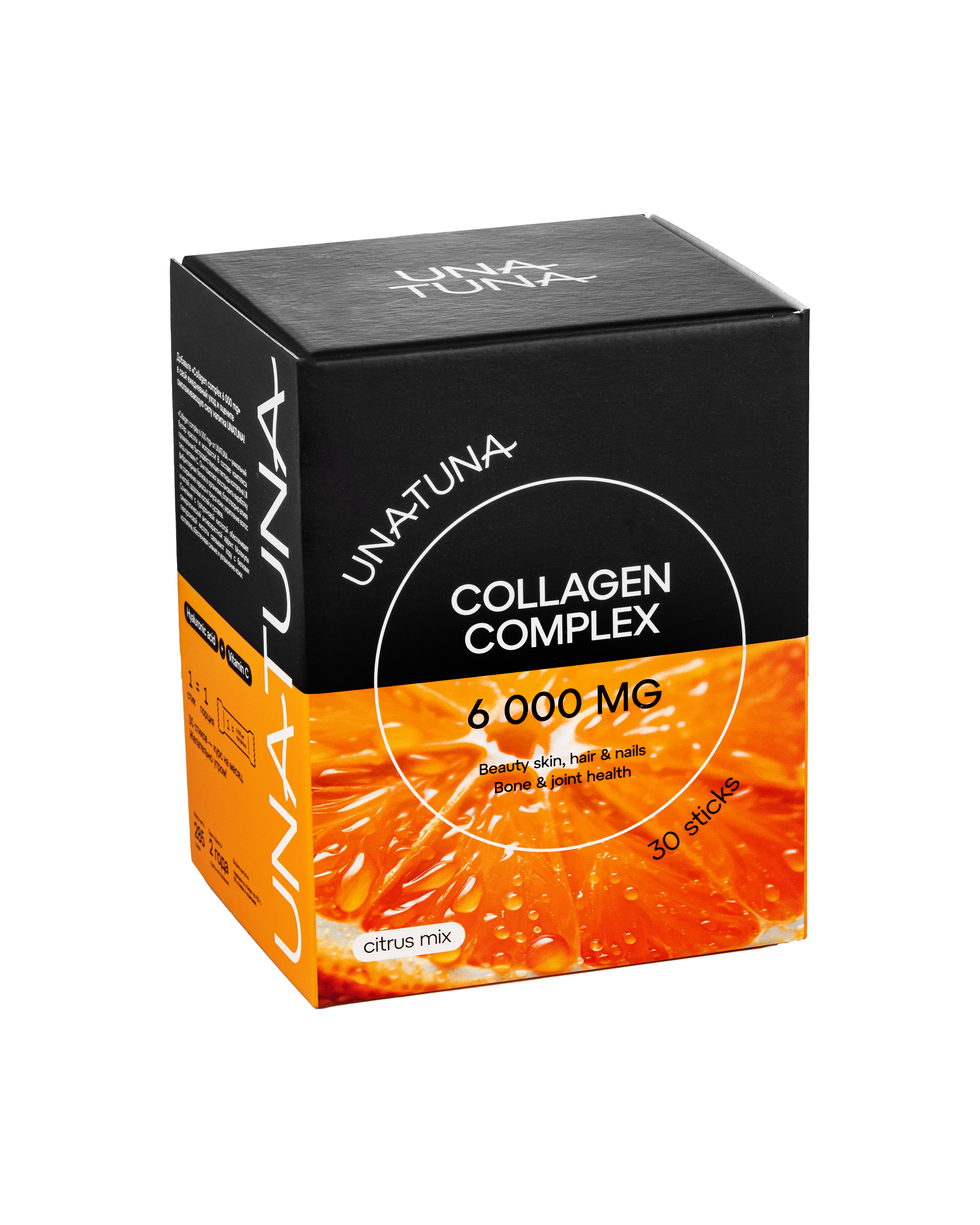 Коллаген от UnaTuna – это витаминный комплекс, содержащий пептиды коллагена, витамин С и гиалуроновую кислоту. Основная функция коллагена – поддержка соединительной ткани и борьба с возрастными изменениями. Именно поэтому так важно принимать коллаген для лица: он сокращает сухость и морщины, делая кожу упругой и эластичной. Не менее важен коллаген для волос: он ускоряет их рост, способствует укреплению и значительно сокращает выпадение. Многие также применяют коллаген говяжий для суставов: он устраняет боль и хруст, улучшая подвижность тела. Таким образом коллаген питьевой – это незаменимая добавка для здоровья кожи, волос, ногтей и опорно-двигательной системы. Лучше всего усваивается коллаген с витамином С и гиалуроновой кислотой. Именно поэтому состав коллагена от UnaTuna отличается максимальной биодоступностью и усвояемостью.